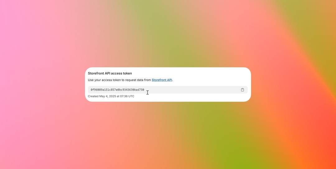 You'll now see your Storefront API access token. Copy it and keep it safe. Don't share this with anyone since it gives access to your store's data.