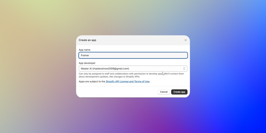 Go to your Shopify admin panel and click on the search bar. Type in "app development" and open it. From there, click "Create an app" and give it a name ("Framer" works fine).